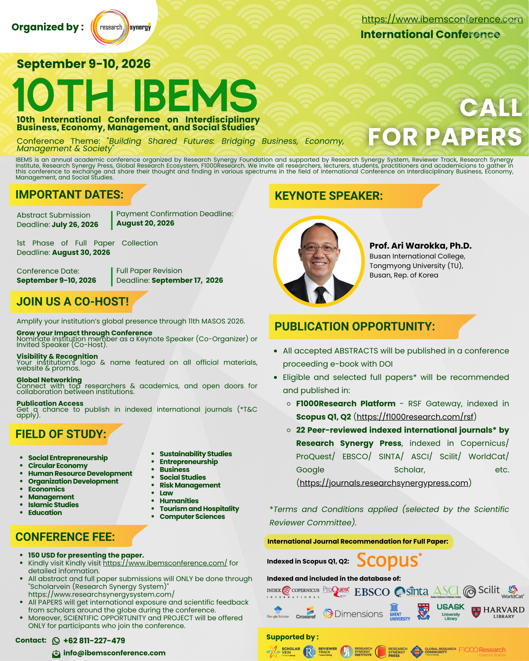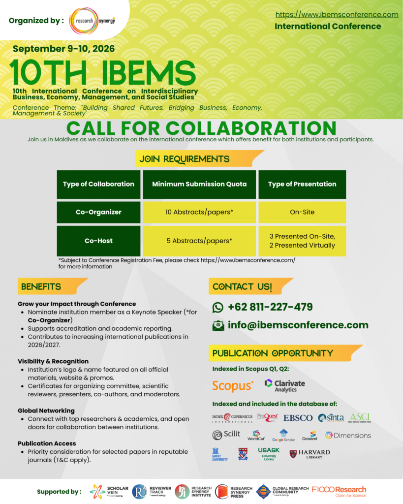 IBEMS is an annual academic conference organized by Research Synergy Foundation. supported by Scholarvein, Reviewer Track, Research Synergy Institute, Research Synergy Press, Global Research Community, and F1000 research.
